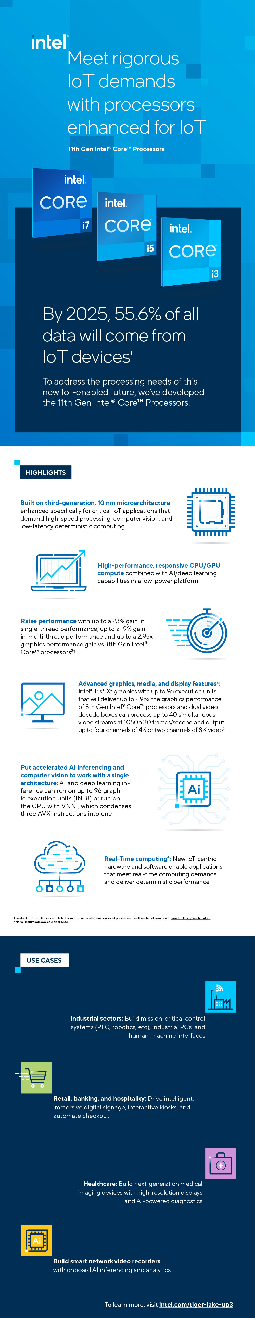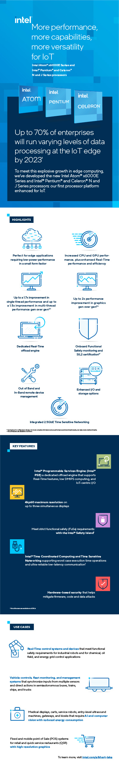 Computing at the edge has become more important than ever. With increasing workloads, more complex environments, and more data to analyze; yesterday’s processors can’t meet the intelligence demands of today. Introducing Intel’s latest platform enhanced for IoT. The Intel Atom® x6000E Series processors, Intel® Pentium® and Celeron® N and J Series processors for Embedded & IoT applications are built to drive performance, integration, and versatility.