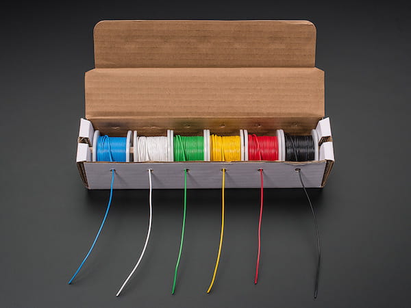 Perfect for bread-boarding, free wiring, etc. This box contains 6 spools of solid-core wire. The wire is easy to solder to and when bent it keeps its shape pretty well. We like to have a few spools of this stuff around which is why this set is quite nice! We suggest picking up wire strippers to match. Wire gauge is 22 AWG which we've found is the best all-around gauge, it works best with breadboards and perfboards but also fits in terminal blocks nicely