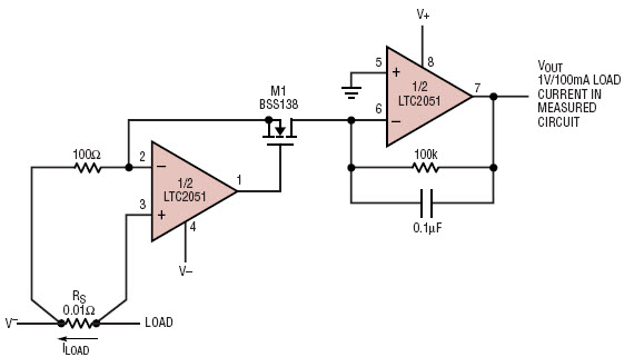 • LTC2051 being used to sense current in negative power supply. low offset of LTC2051 allows use of a very small sense resistor, RS