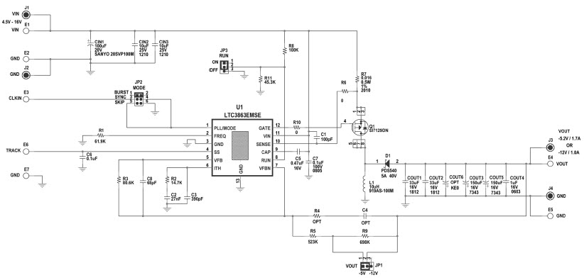 • DC1737A, Demonstration Board using LTC3863 inverting DC-DC PMOS controller for automotive and industrial applications. The board operates from an input range of 4.5V to 16V, and provides a -5.2V, 1.7A output or a -12V, 1A output. It operates at 400kHz and may be synchronized to an external clock. A soft-start feature controls output voltage slew rate at start-up, reducing current surge and voltage overshoot