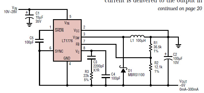 - Circuit shows LT1776, Positive-to-negative converter topology, generates a single negative output voltage from a positive input voltage, using just an ordinary inductor