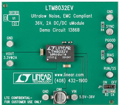 • Demonstration circuit DC1386B features the LTM8032, a 2A EN55022 Class B certified step-down converter. This Module regulator is configured to deliver a 3.3V output from an input voltage between 5.5V to 36V at a switching frequency of 600kHz