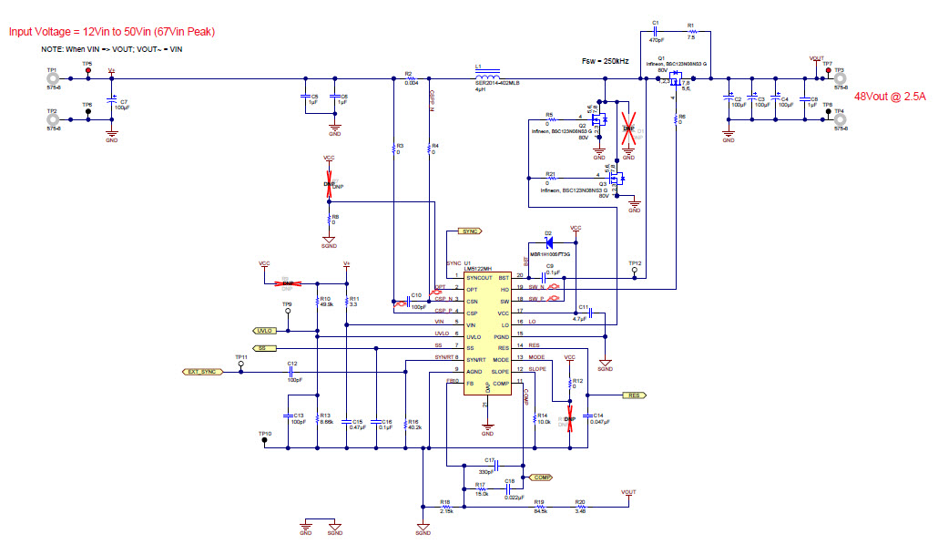 - PMP7965, A single-phase synchronous boost converter accepting an input voltage of 12Vin to 50Vin with a peak of 67Vin and providing an output of 48Vout capable of supplying 2.5A of current