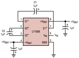 • Typical Application Circuit for LT1026CS8 Voltage Doubler and Inverter. The LT1026 is a switched capacitor voltage doubler and inverter on a single monolithic die. Capable of operating from a 4V to 10V input, it provides ±7V to ±18V output. Output currents of over 10mA are available. Two charge pumps first double the input voltage then invert the doubled voltage. Manufactured in bipolar technology, the LT1026 is not susceptible to latch up and generates up to 36V