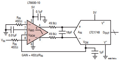 • Typical Application Circuit for LT6600CDF-10 Very Low Noise, Differential Amplifier and 10MHz Lowpass Filter. The LT6600-10 combines a fully differential amplifier with a 4th order 10MHz lowpass filter approximating a Chebyshev frequency response. Most differential Amplifiers require many precision external components to tailor gain and bandwidth