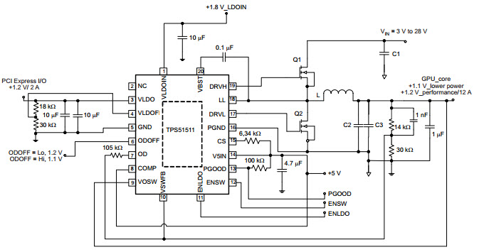 Typical Application Circuit for TPS51511 Synchronous Switcher Controller for D-CAP Mode, RDS(ON) Sensing, 1-Bit DAC for the Output Voltage Dynamic Change