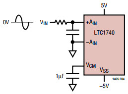 • Typical Application Circuit Using LTC1740 14-Bit, 6Msps Sampling ADC for Dual Supply System. The LTC1740 is a sampling A/D converter that draws only 245mW from either a single 5V or dual 5V supplies. This easy-to-use device includes a high dynamic range sample-and-hold and a programmable precision reference