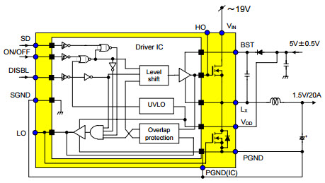 • Typical Application for This product is a synchronous buck switching converter module. The additional components for DC-DC converter are a PWM control IC, an external inductor, and input and output capacitors