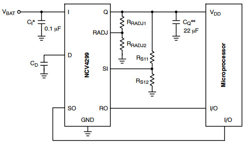 • Typical Application Showing all Compensation and Sense Elements for the 8 Pin Package Part for NCV4299 150mA Low-Dropout Voltage Regulator