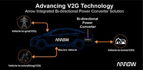 Arrow bietet eine integrierte bidirektionale Spannungswandlerlösung für Elektrofahrzeuge (EVs) mit einem robusten mobilen Energieladegerät an. Dadurch kann das Fahrzeug sowohl Elektrizität speichern als auch bei Bedarf wieder zur Versorgung von Gebäuden (Vehicle to Home, V2H) oder zur Einspeisung ins Stromnetz (Vehicle to Grid, V2G) bereitstellen. Die Weiterentwicklung der Möglichkeiten von V2H und V2G leistet einen Beitrag, um vorübergehende Stromnachfragespitzen abzufedern und nicht genutzte Batterien als Energiequelle zu nutzen. Dies kommt der Entwicklung intelligenter Städte zugute, die nachhaltigerer und energieeffizienterer sind.