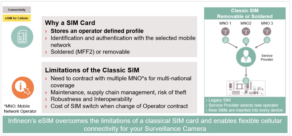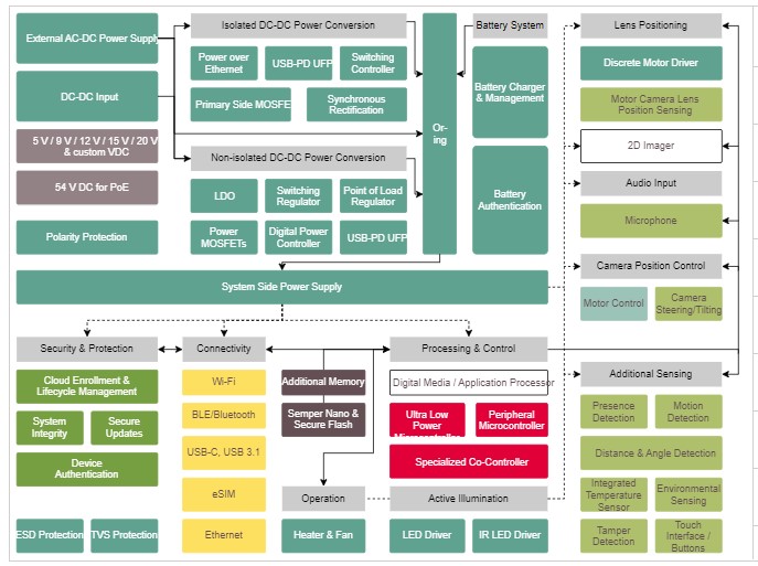 For stable connection of the camera system to the cloud and management systems, Infineon offers a broad range of connectivity solutions for Wi-Fi, Bluetooth, and USB. As every connected device can be an object to cyberattacks, Infineon’s Optiga Trust family allows you to make your systems more robust against cyber threats.