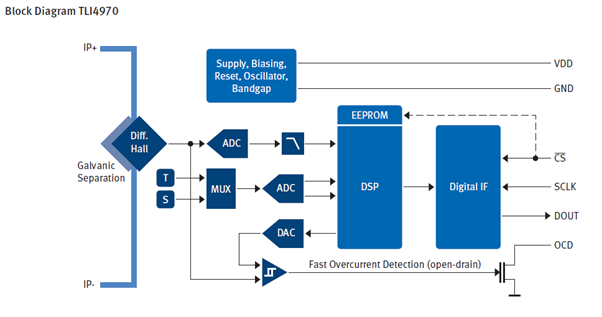 • The TLI4970 provides superior accuracy compared to existing open or closed loop systems with magnetic cores. It has additional functionality such as overcurrent detection, zero crossing detection and programmable filters, but offers a significantly smaller footprint and power consumption.